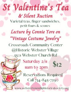 Varietal teas, finger sandwiches, petit fours & scones will be served. Featuring a lecture by Connie Yore on “Vintage Costume Jewelry” and a silent auction of costume jewelry. $12/person; limit 40 people. Please call 734-845-7290 to register for the tea. Check and credit card payments accepted.