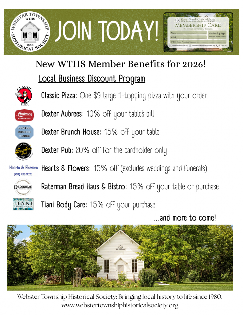 The Webster Township Historical Society (WTHS) owns and manages seven historic buildings, six of them located in Historic Webster Village at 5583 Webster Church Road in Webster Township just outside of Dexter, MI. The seventh historic building is Crossroads Community Center (still referred to many as the “Community House”) located at 5501 Webster Church Road, adjacent to the village. These buildings are maintained solely by WTHS through donations, membership dues, and grants. Four of our buildings are over 150 years old! With our new walking path in place connecting the village buildings, the village is often referred to by visitors as a mini-Greenfield Village. Explore our website and come visit